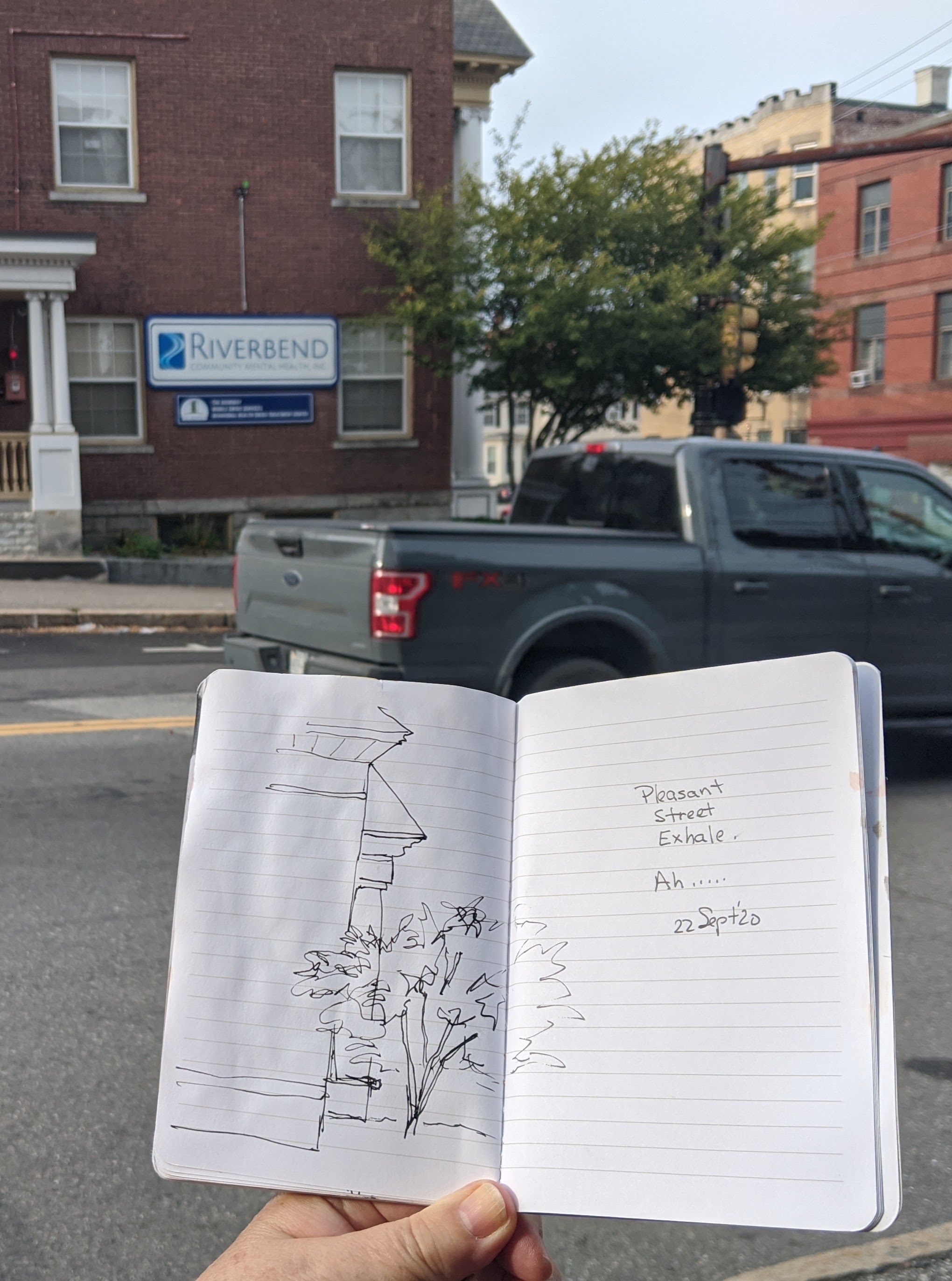 So without hesitation I stopped, the same way I would if I had spotted a dear friend. I stopped because I know enough to honor a “Look at That!” nudge from the universe. I took a seat on the granite wall, pulled out my very cheap notepad and beloved fountain pen, and began. I took a sacred five minutes to simply say thanks for the pause, to draw what drew me.