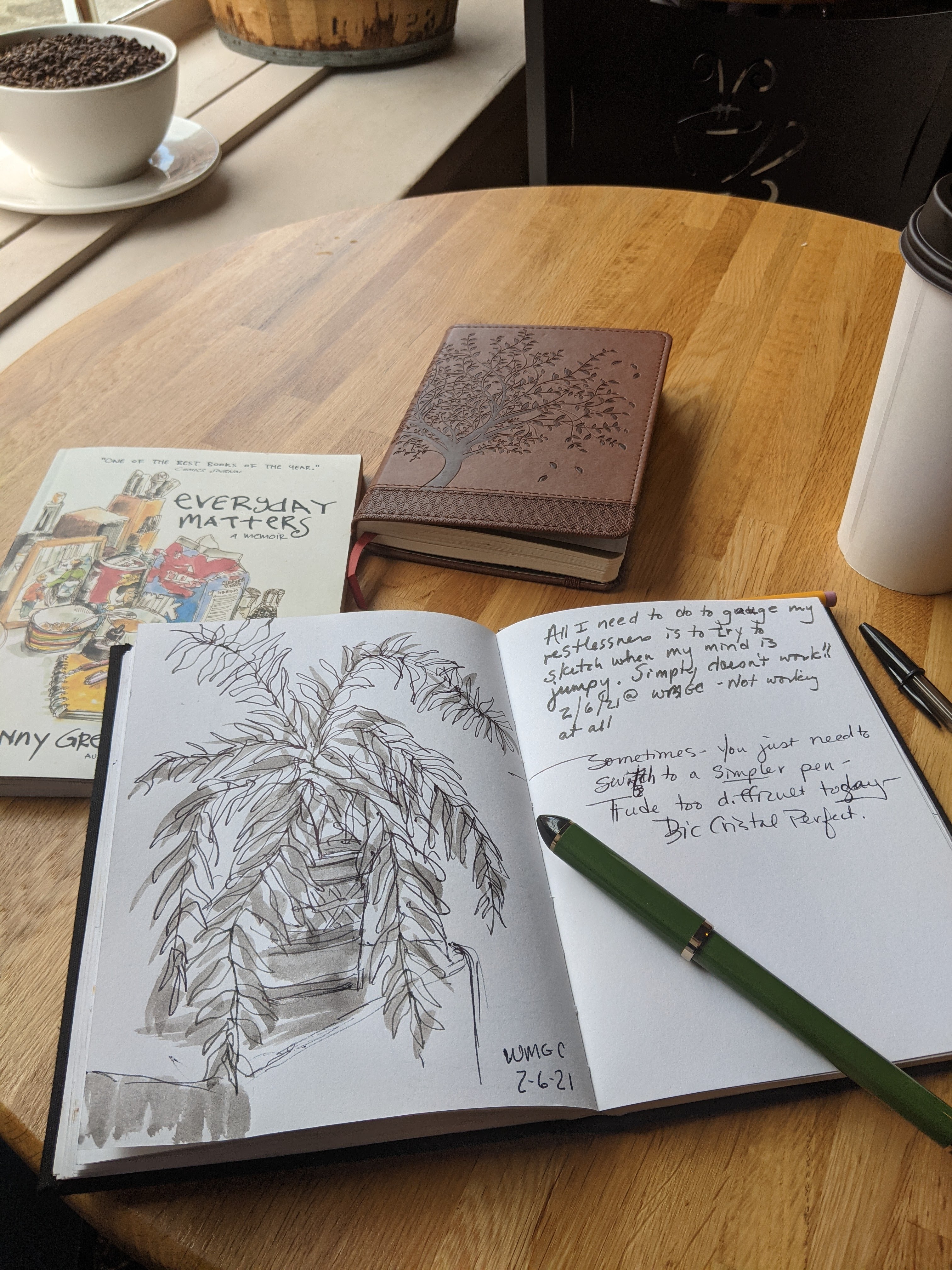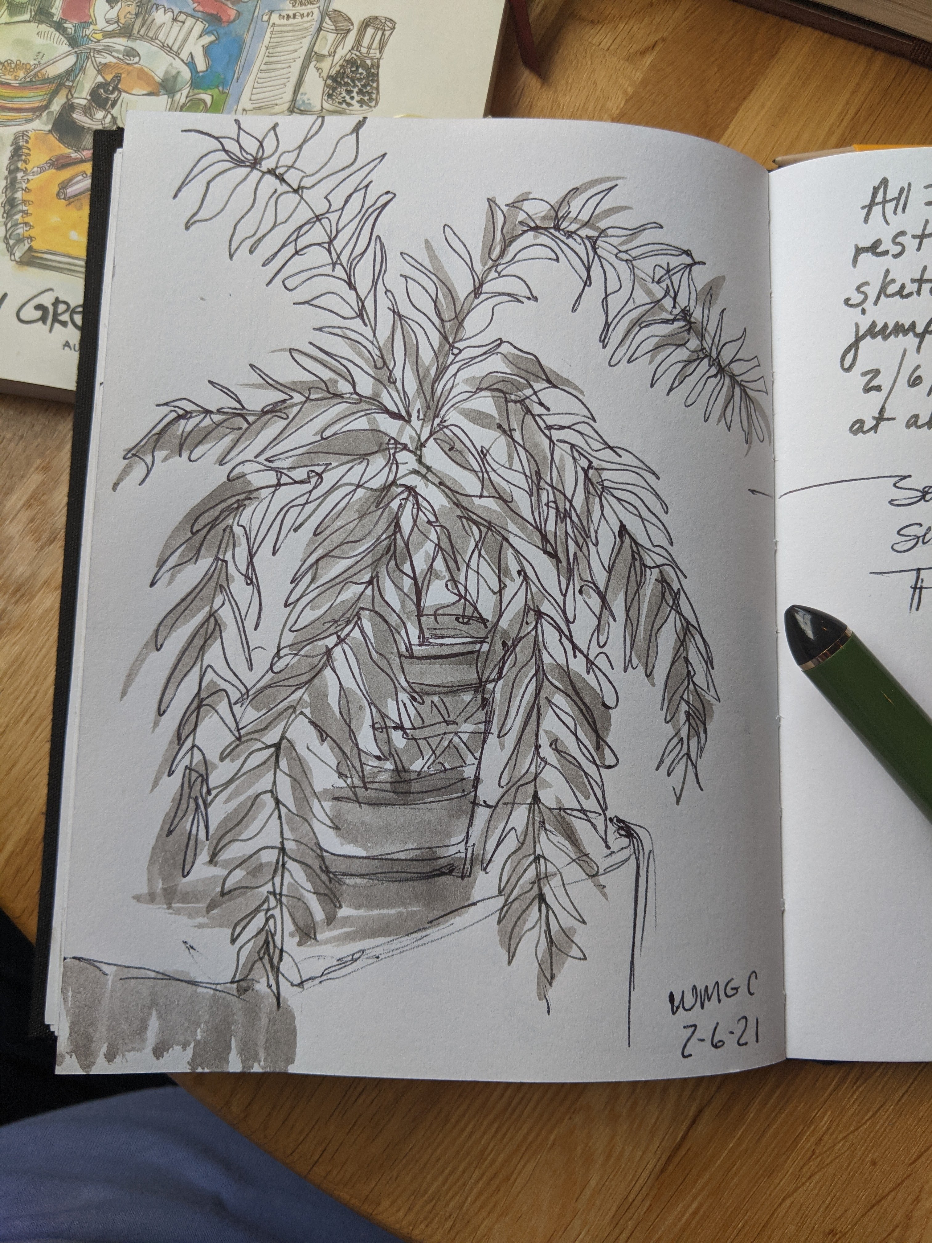 After getting my coffee and cookie, I settled down to journal a little then sketch. Nope, too restless to journal, must be time to get right to sketching. Pull out the sketchbook and favorite Sailor Fude pen with that great bent nib and . . . insert screeching sound of brakes. Inside my head. Every line on the page was wrong, wonky, ill-placed. What??