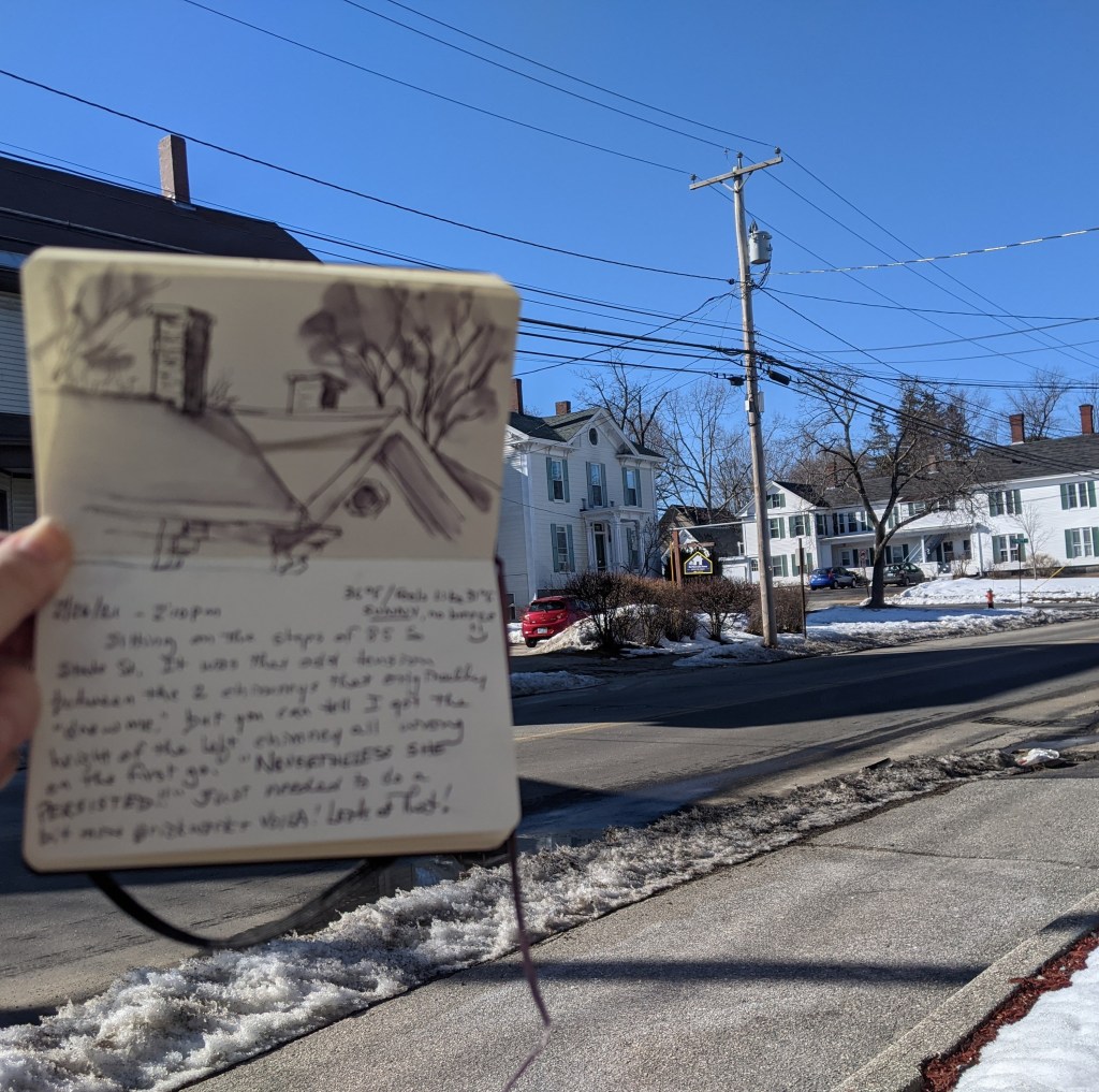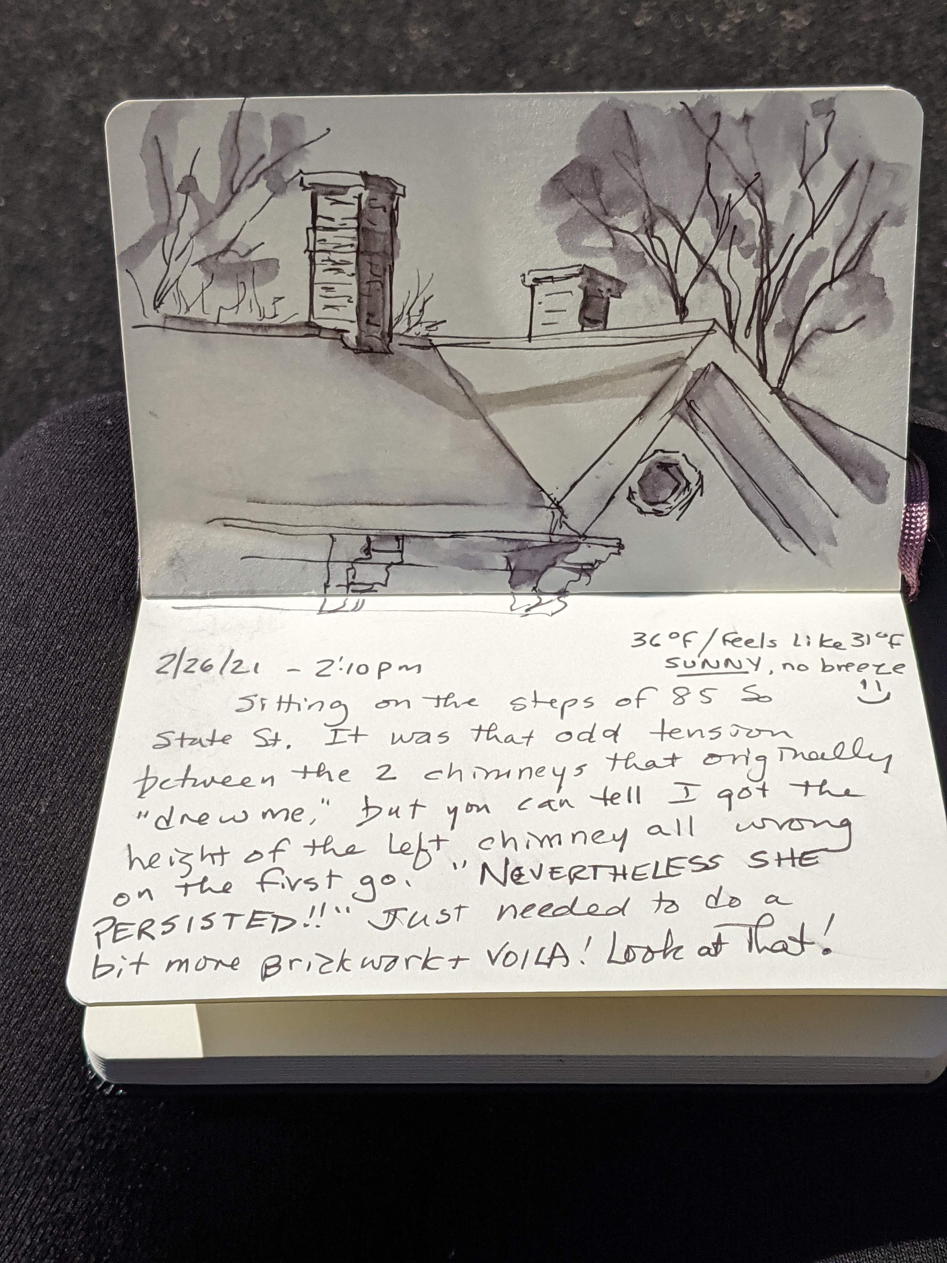 I wanted to do a fairly quick sketch, and when I “came to” and compared the scene to the sketch, I saw my skyhole wasn’t quite right. No worries, it’s just practice seeing and sketching! I added several more courses of brick to the left-hand chimney and voila, I achieved that heavenly state of a smiling “good enough.”