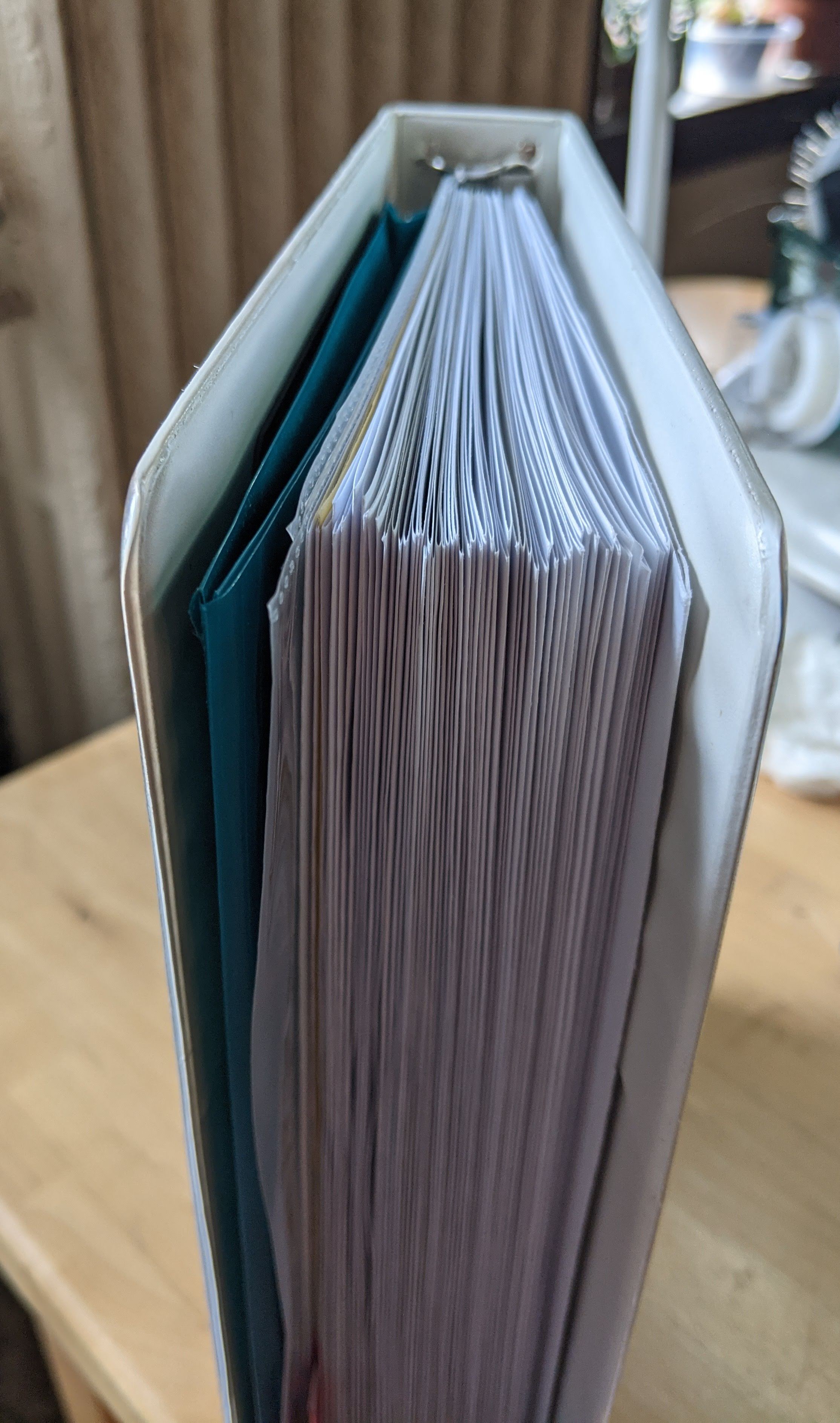 Here’s another peek at the cover, and a glimpse of how thick the printout is as of today. It’s 7pm, time for a final pot of tea, and back to the keyboard grindstone!