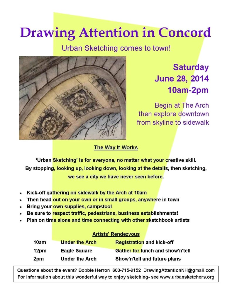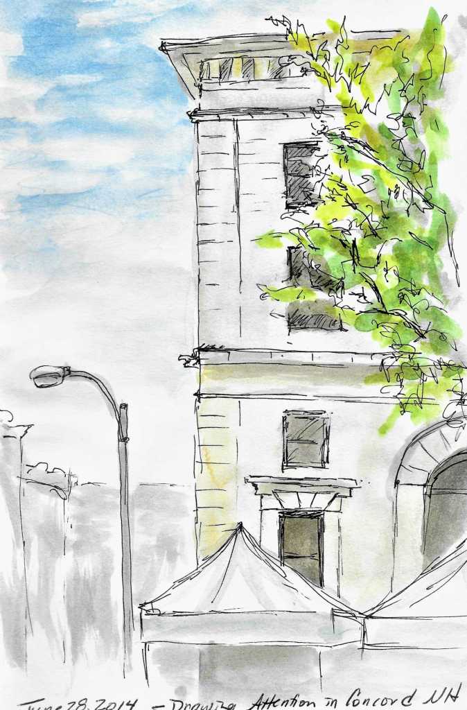 This afternoon we had the first meeting of the Drawing Attention Sketchers’ Group here in Concord. I’ve been planning this for a couple months, since mid-April, hoping to offer beginning and experienced artists a way to meet and have fun sketching together, outdoors, right here in our wonderful little city.