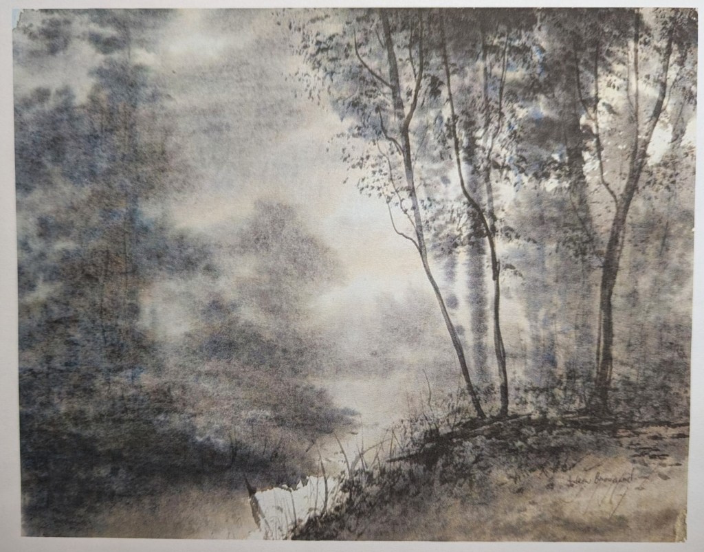 Along with these luminous full-color paintings, Broussard has created a separate series of “tonalist paintings” fashioned after another group of American painters from the late 19th century.
