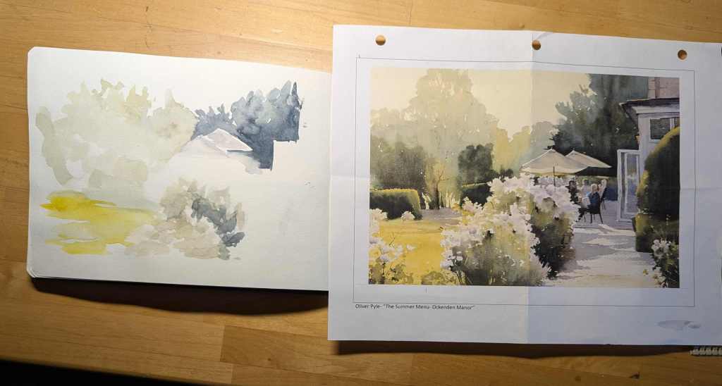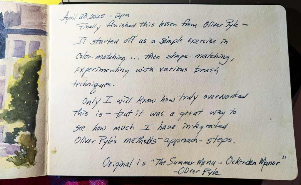 As I continued studying Oliver Pyle’s online tutorials, I kept thinking of one of his paintings that has enchanted me since I first saw it. Finally I ordered a print which is on its way to me. In the meantime, I decided to practice color mixing by attempting to match certain colors in this much-loved painting. I didn’t get it right the first time, so I kept going, and going…
